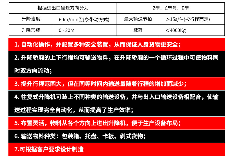 形式多樣,布置靈活,物料可以從各個方向上進出提升機,便于生產設備布局;承載范圍大,最大可達3000Kg;可設置各種安全裝置,提高設備運行的安全性;升降行程為20m;升降速度<30m/min;最大載荷<3000kg;物料種類有包裝箱、托板;裝飾材料為鋁型材+陽光、鋼板、鋁網等;適用于家電,食品,醫藥,煙草,機械加工等行業的垂直輸送。